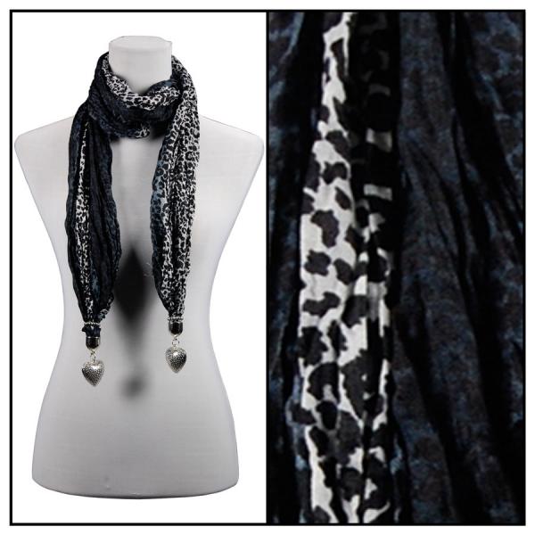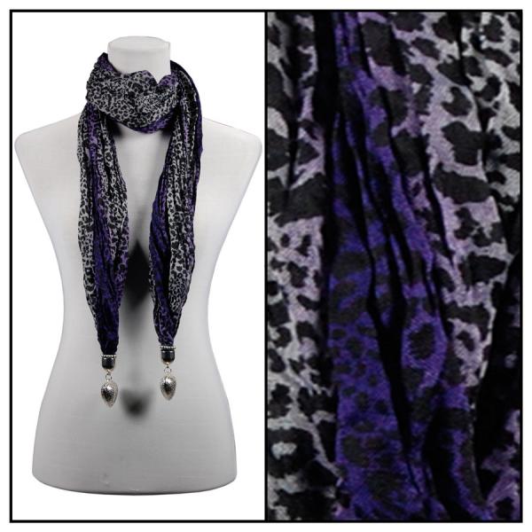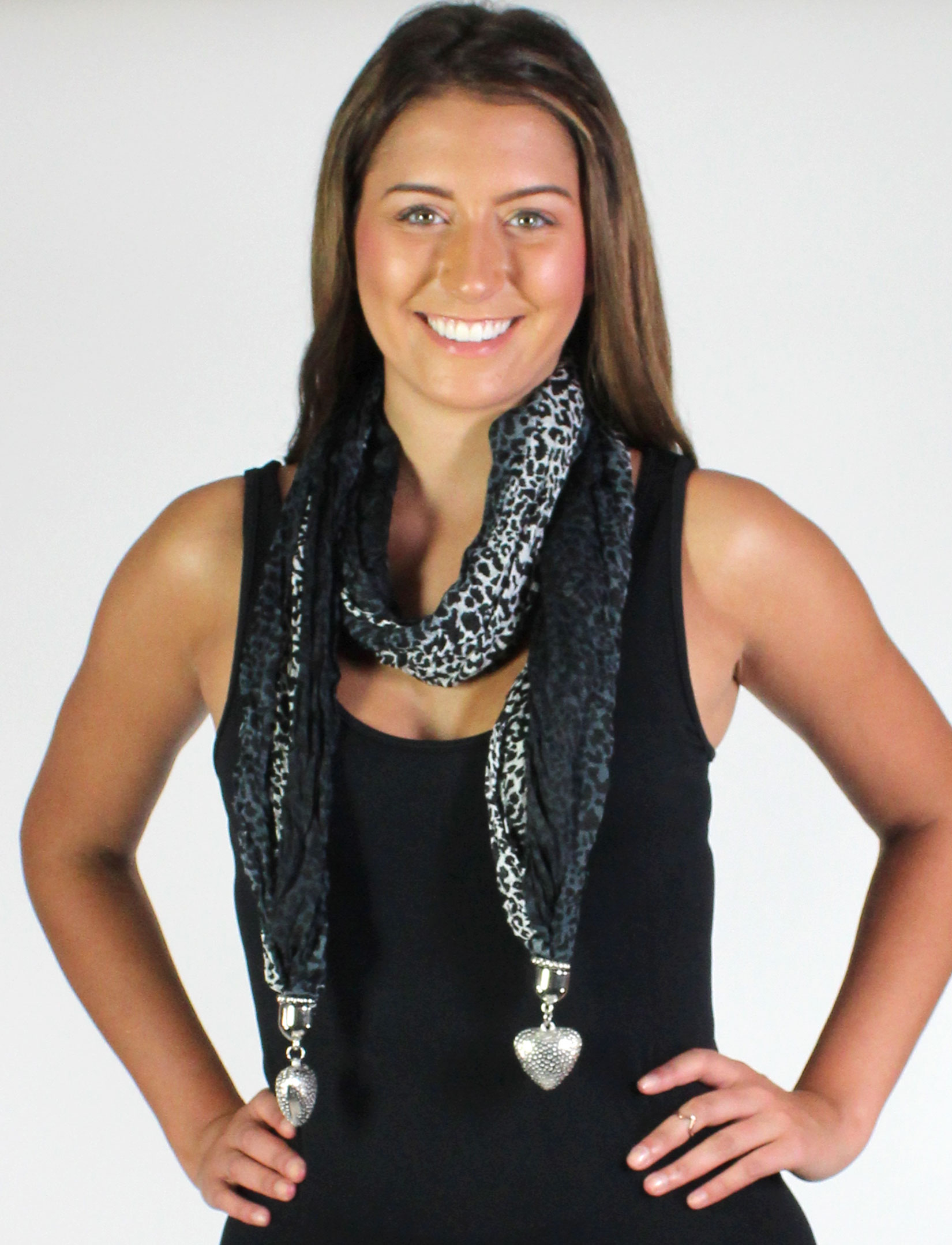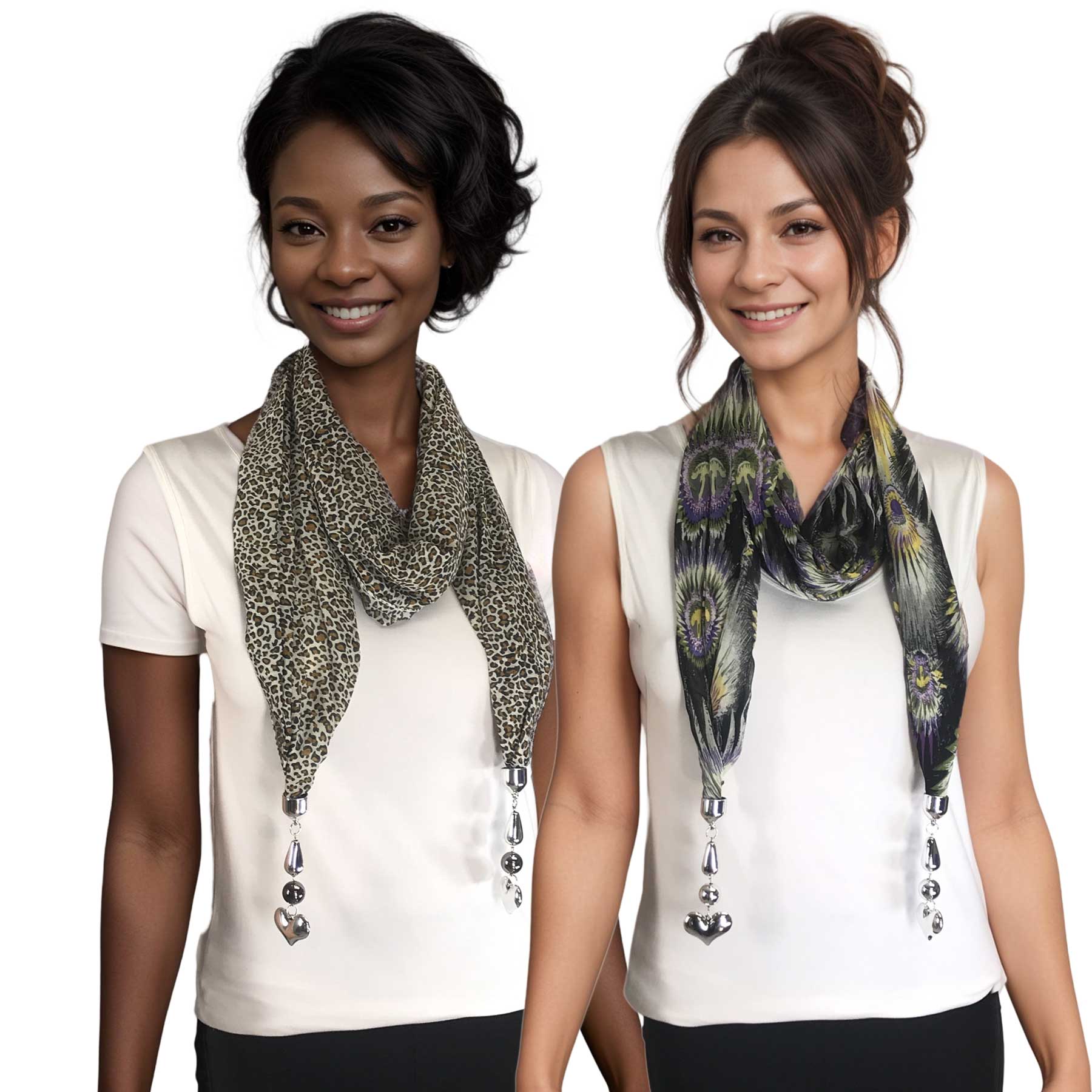 This is a unique variegated pendant scarf with two hammered metallic heart fobs at each end. Available in a variety of colors.