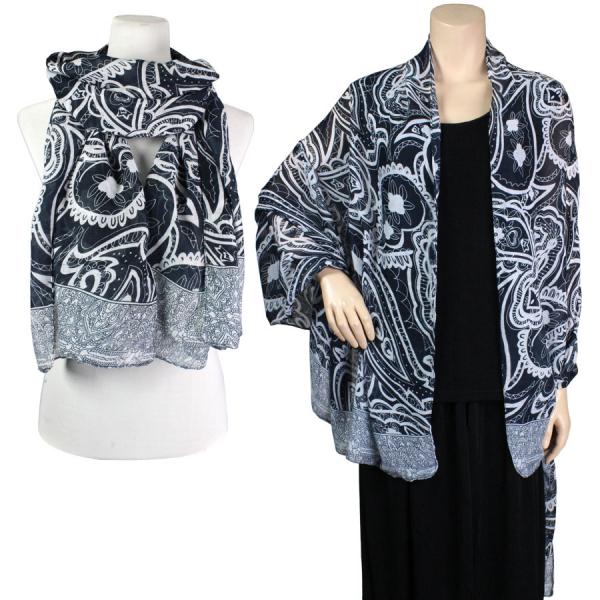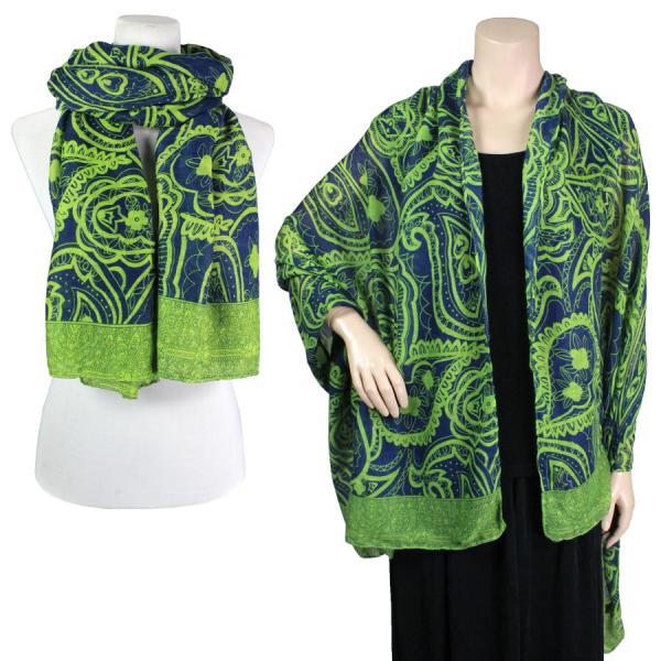 This is a buttery soft piece with an overall paisley print with a vertical design on the ends. It is large enough to serve as a shawl or as a big bunchy scarf.