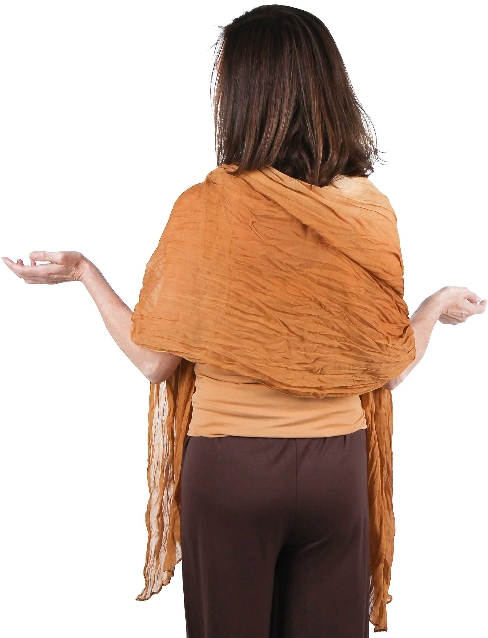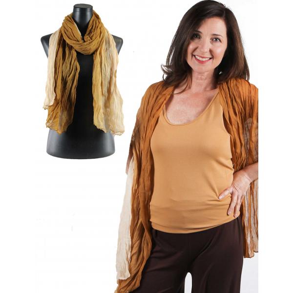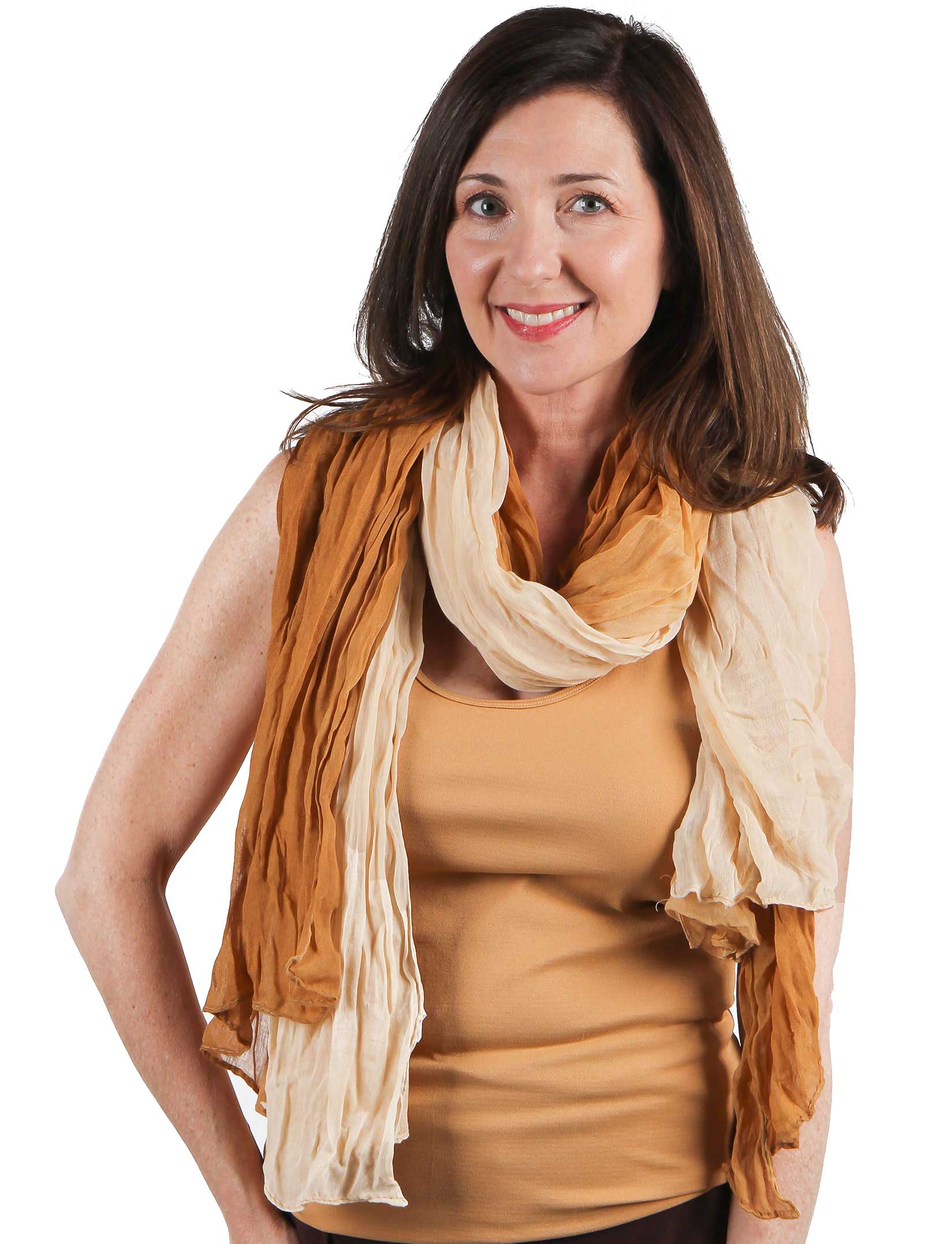 This easy going piece always looks fresh because it is a bouncy crinkle crush and the colors which range from light to dark camel will accent many of your fall prints and solid brown tones perfectly.