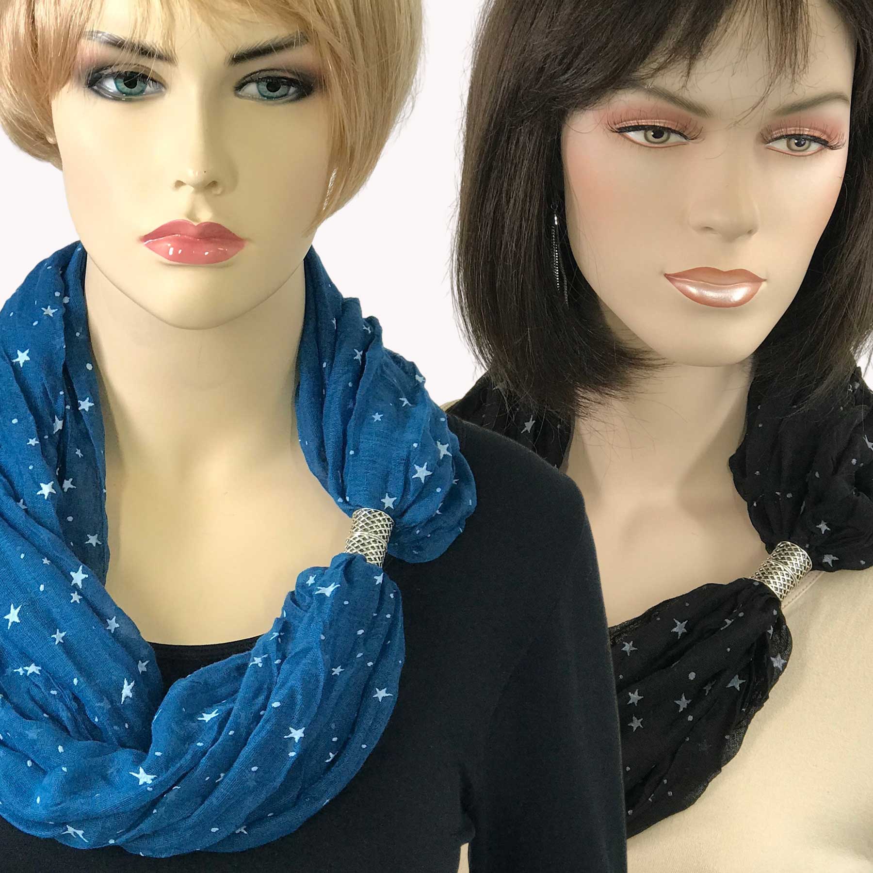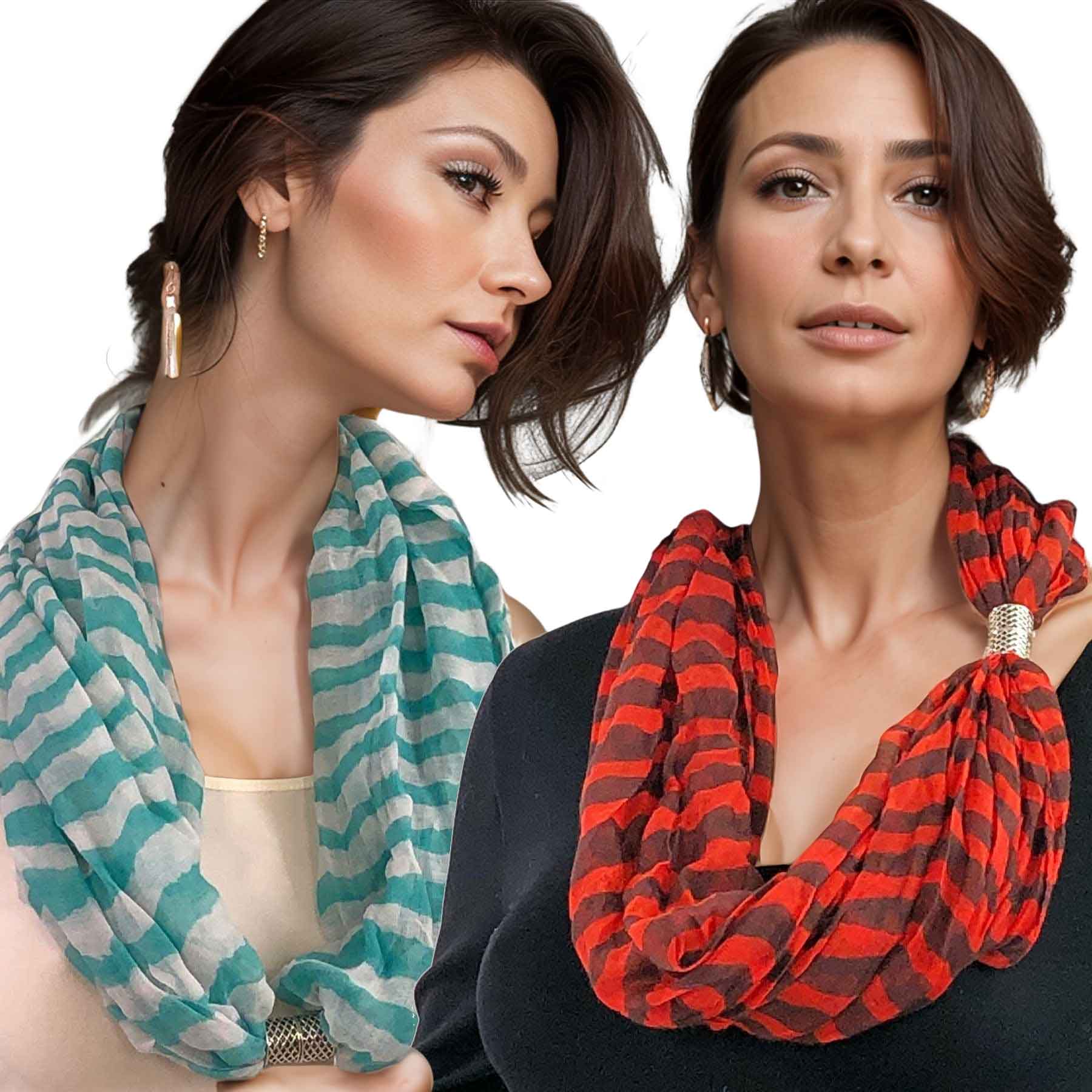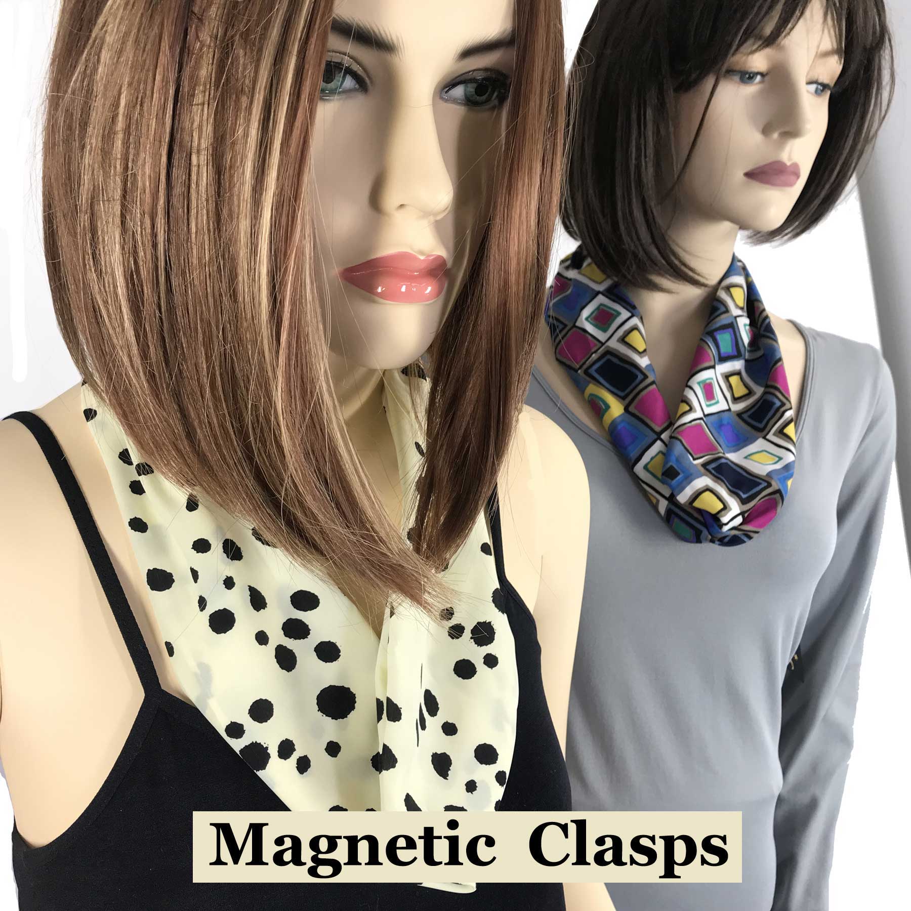We utilize the best fabric to create a soft lovely drape and filigree nickel clasps with powerful ceramic magnets to make sure these scarves stay secure around the neck.