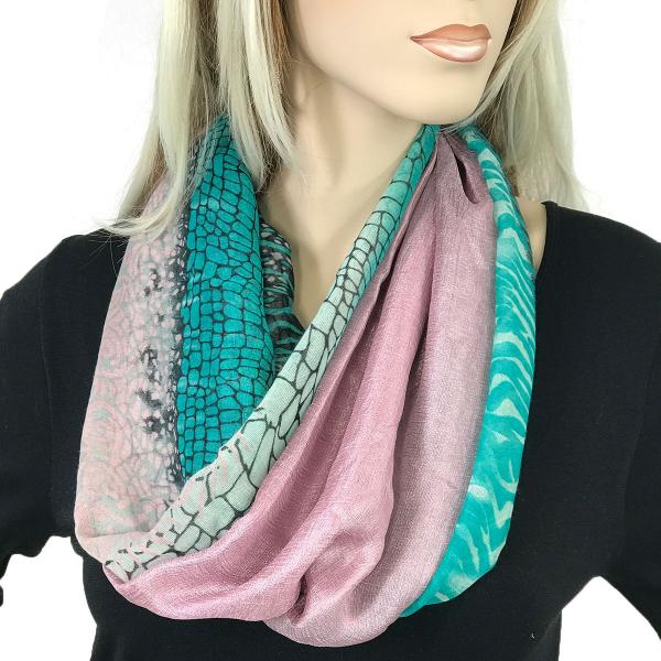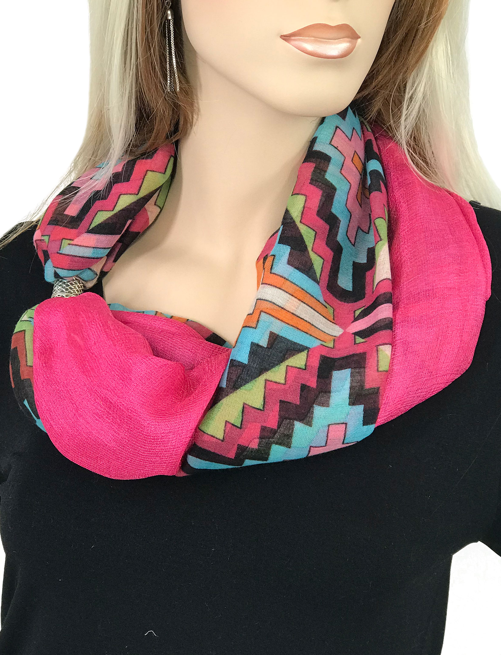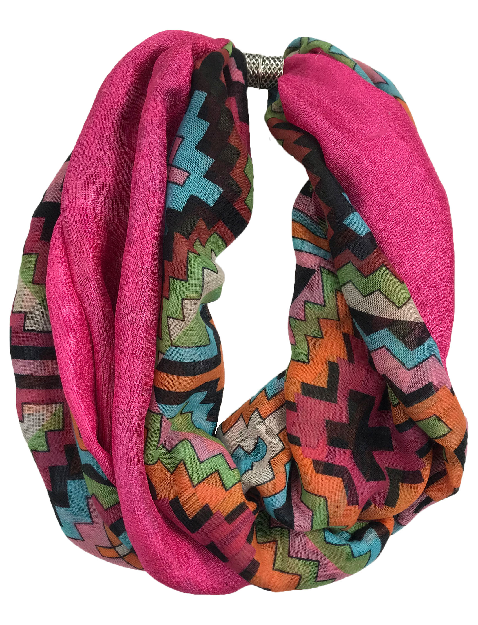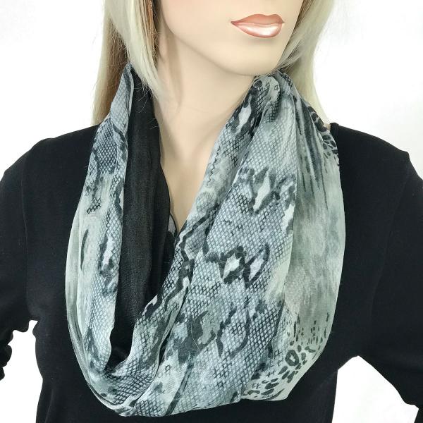 Two fabrics, solid silk essence and cottony prints, are combined to create a dramatic effect, then assembled with magnetic closures to create an stunning oversized infinity that can be worn in many ways.