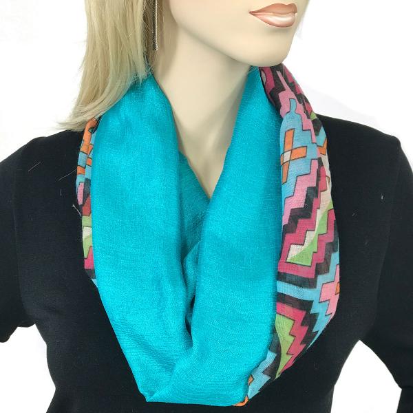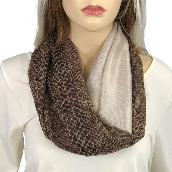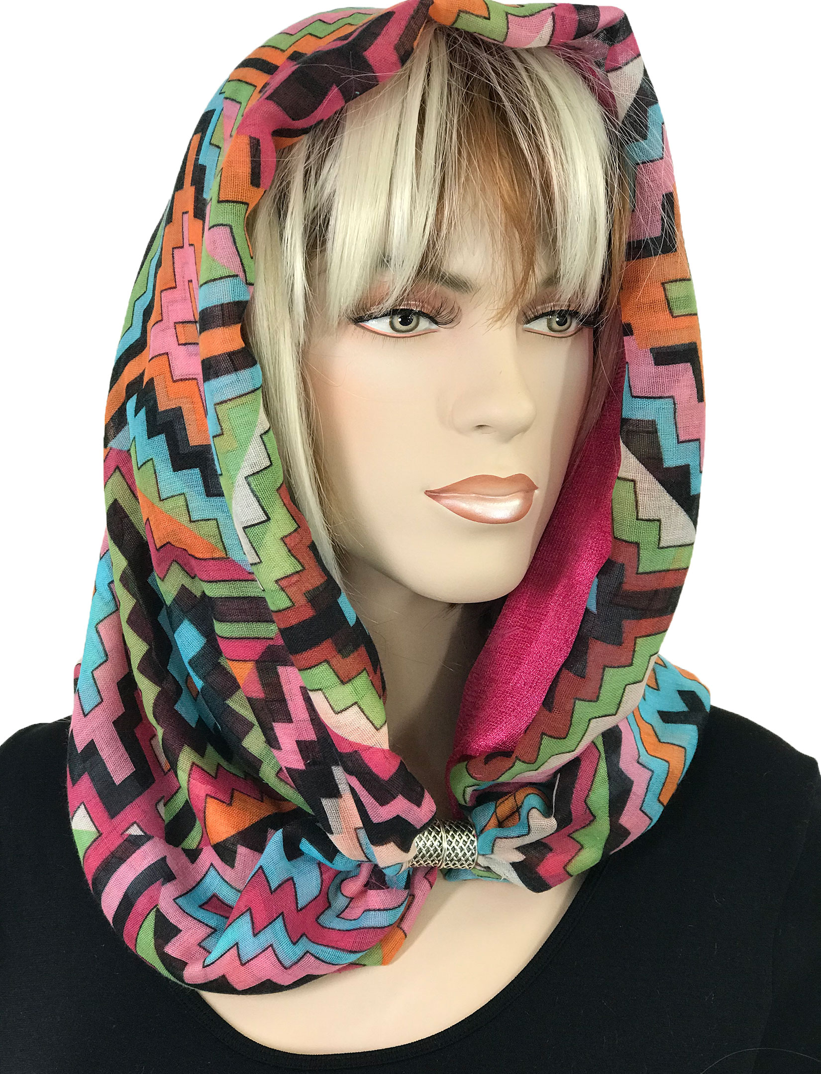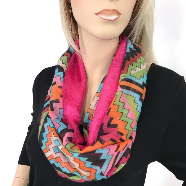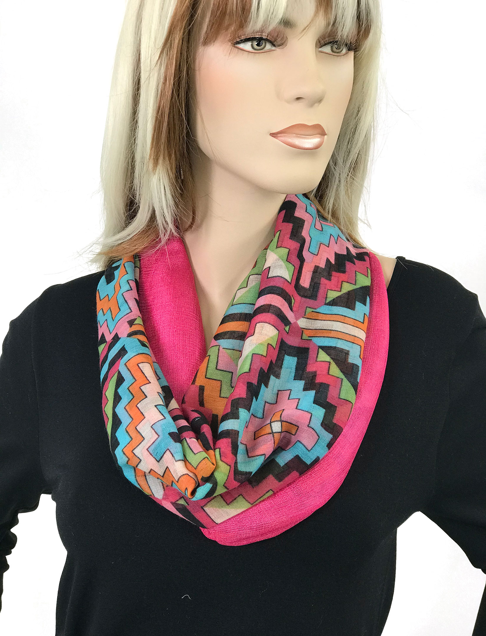 Two fabrics, solid silk essence and cottony prints, are combined to create a dramatic effect, then assembled with magnetic closures to create an stunning oversized infinity that can be worn in many ways.