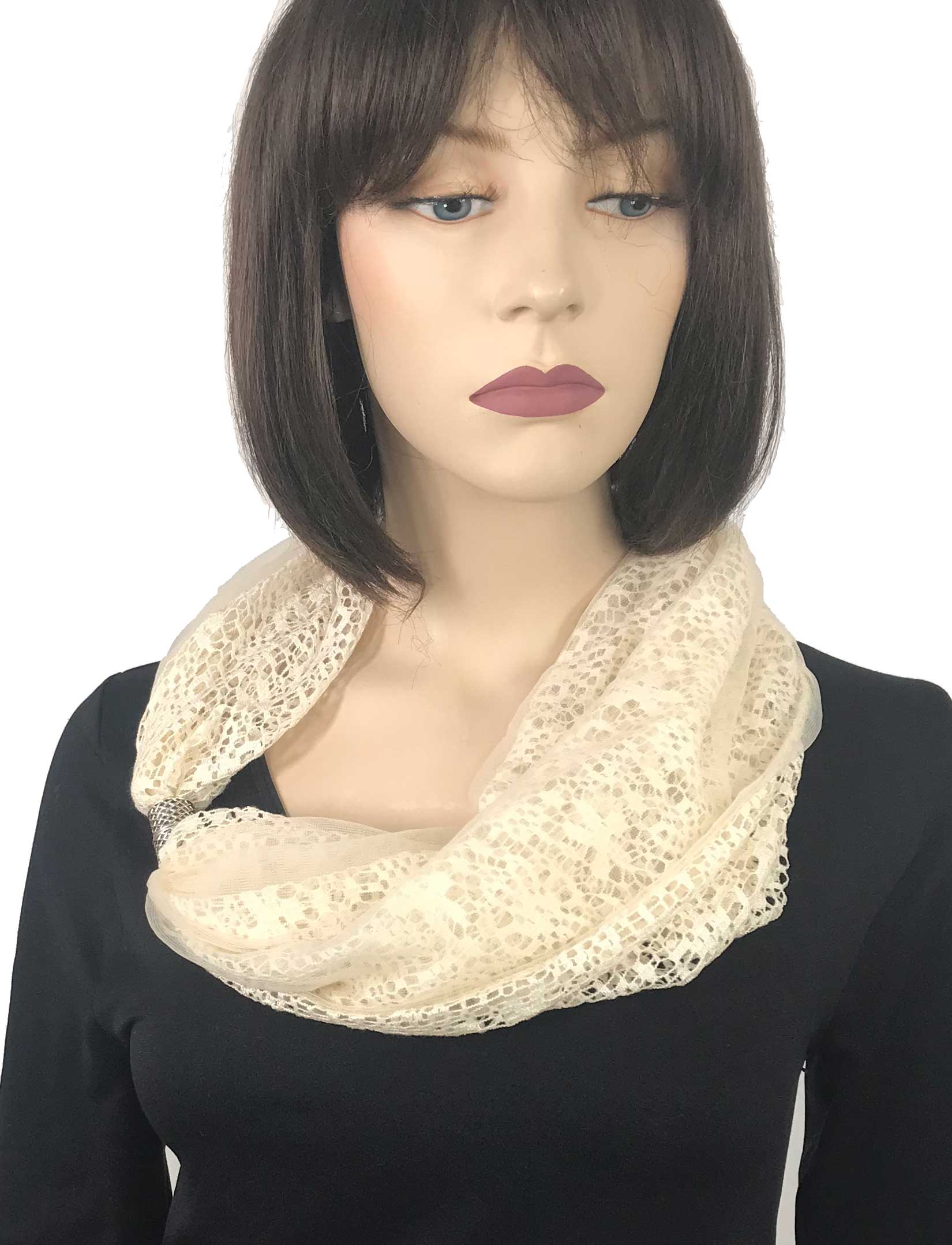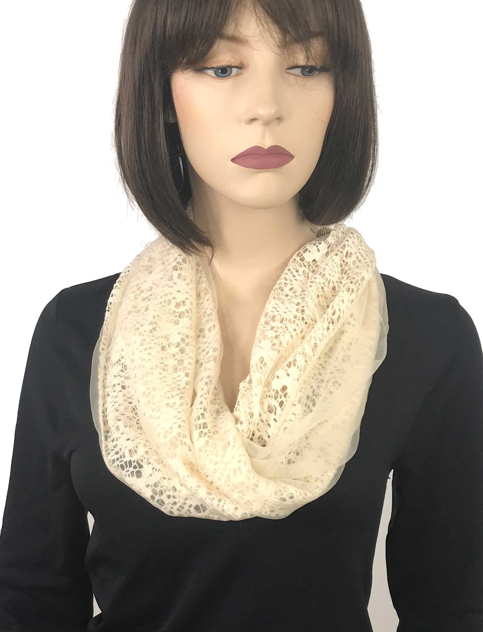 The fabric is a combination of lace and mesh to create an interesting dimension. They are assembled with magnetic closures to create an easy infinity look.