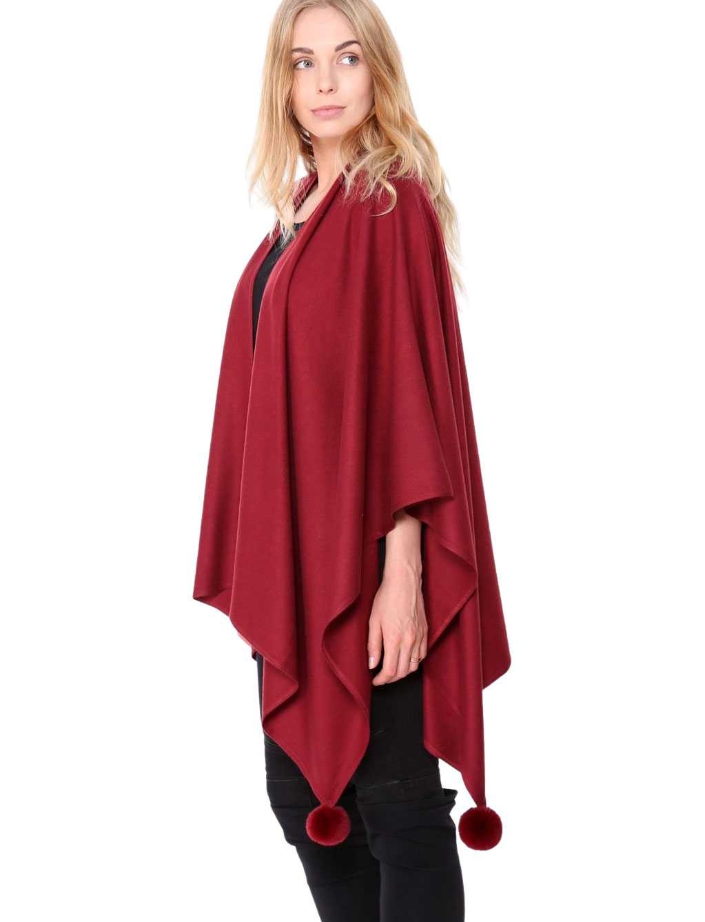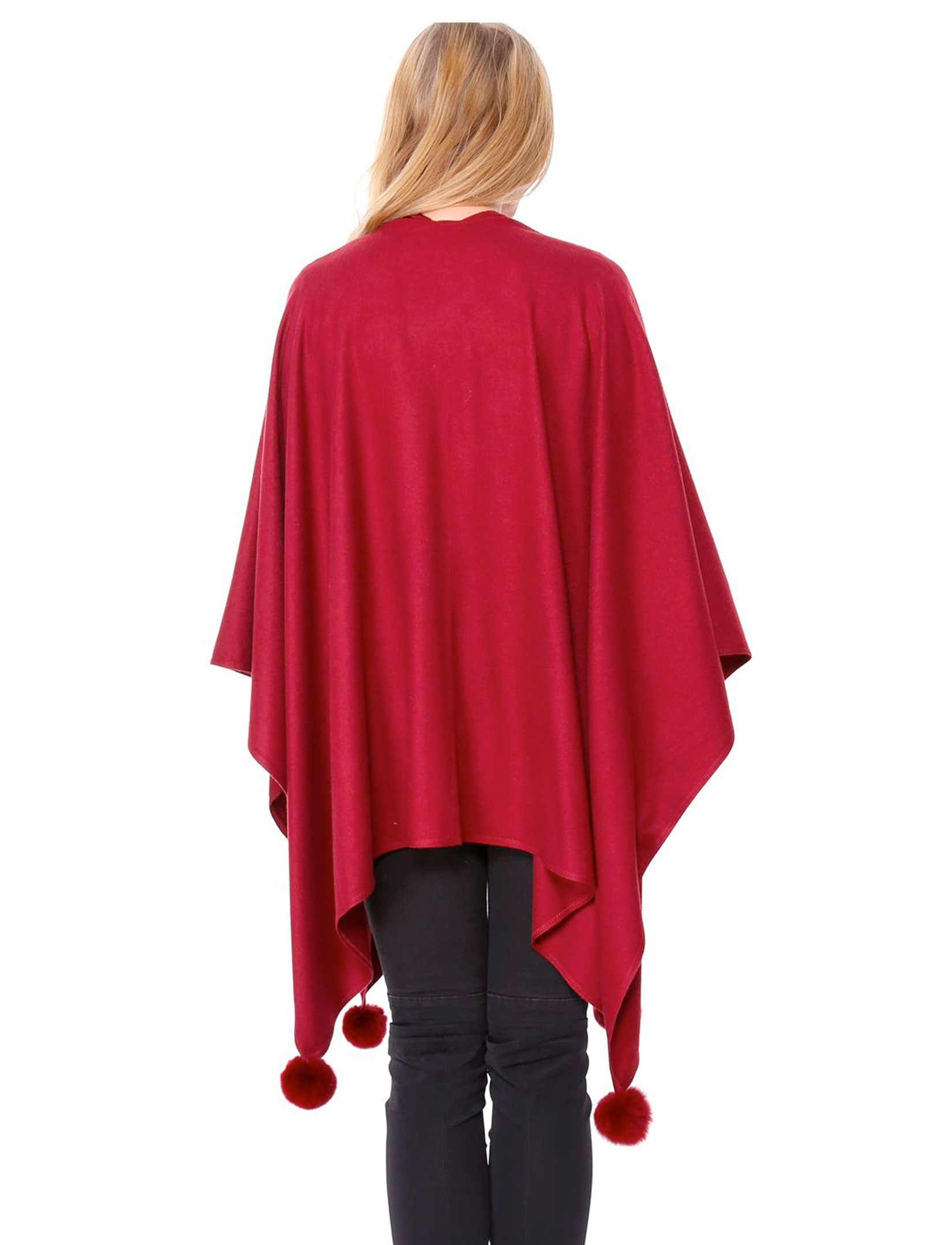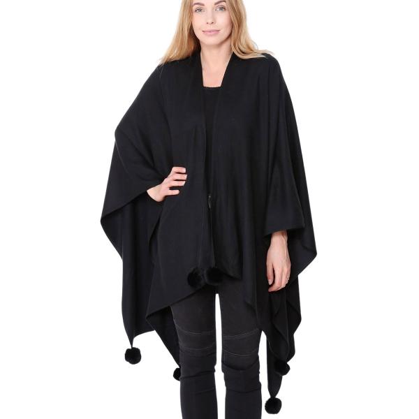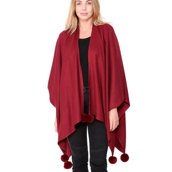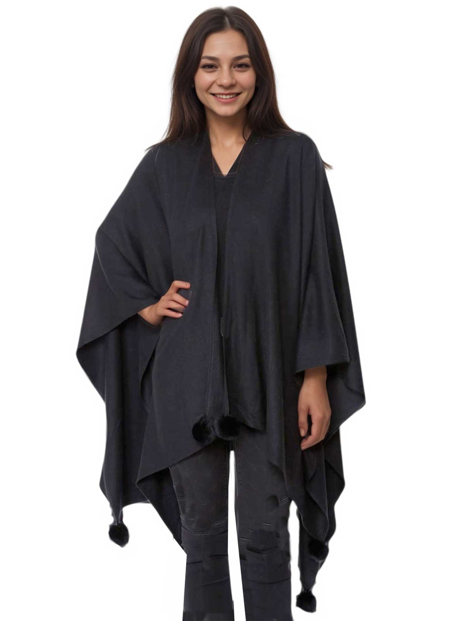 Medium weight elegant ruana shawl with pom pom embellishment.