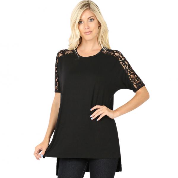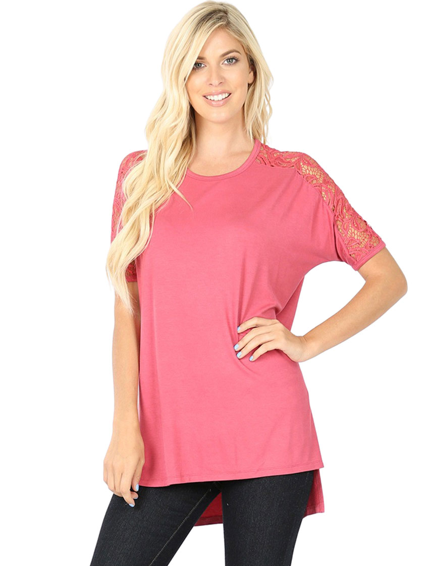 Rayon Lace Short Sleeve Round Neck with Side Slit High-Low Hem Top