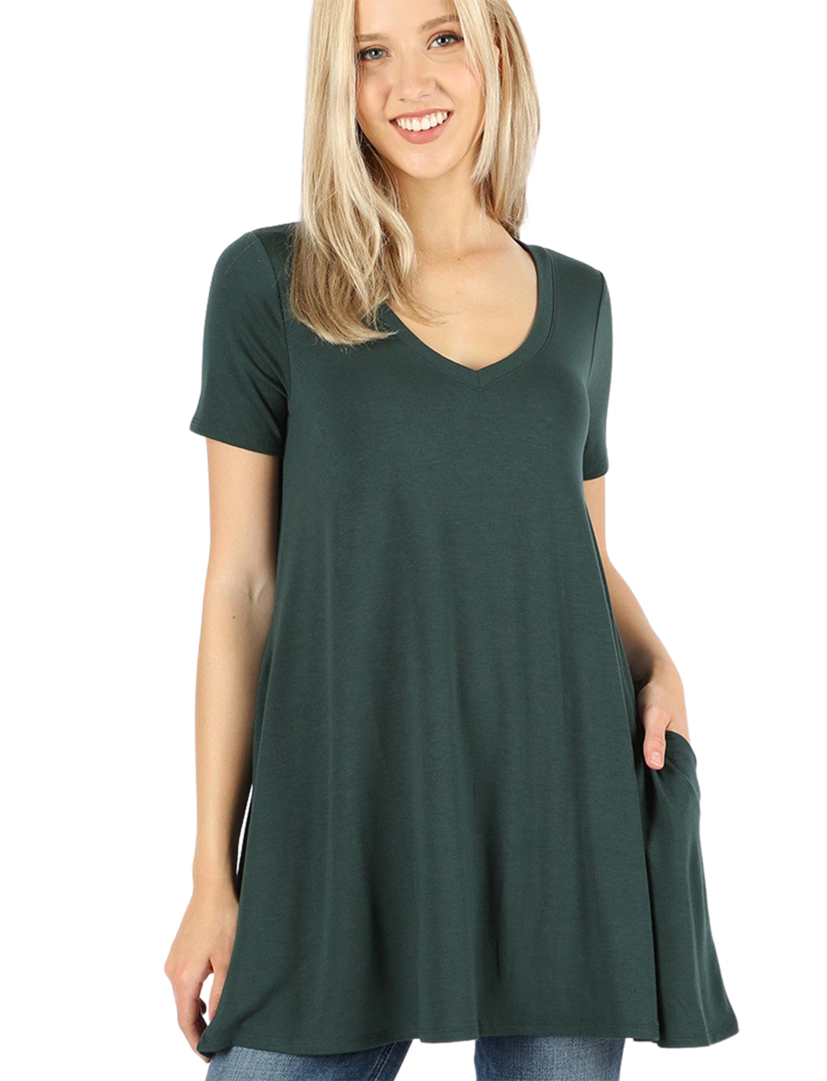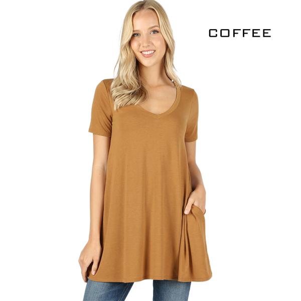 Shirt Sleeve V-Neck Flared Top With Side Pockets