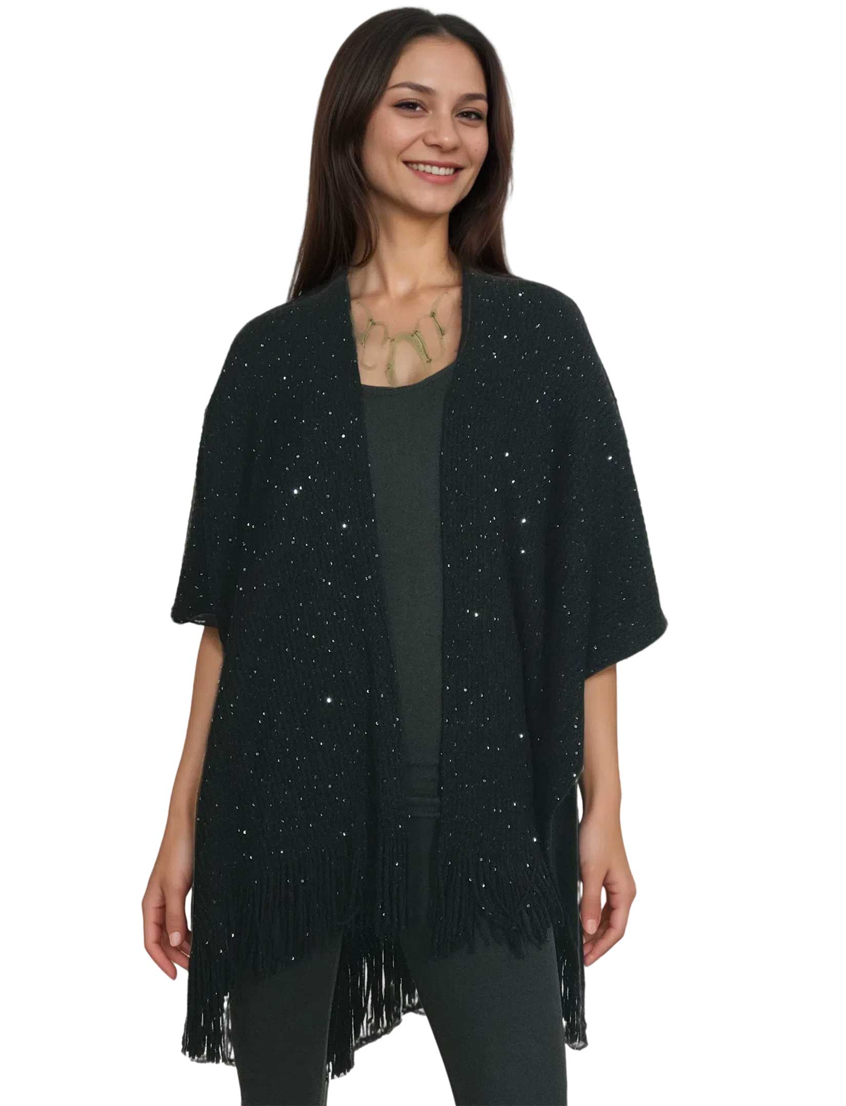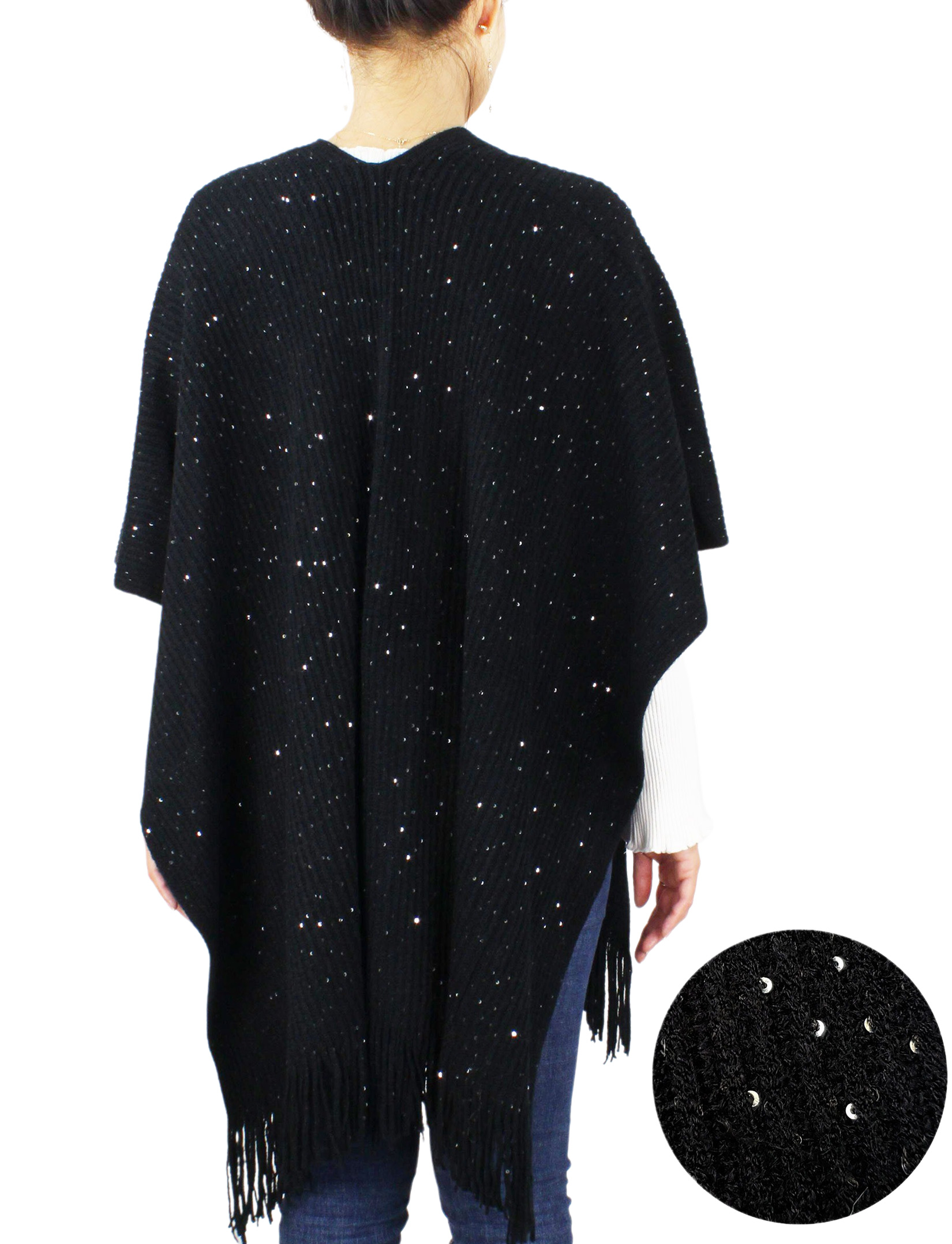 Make every occasion special with a soft knit ruana cape embellished with sequins.