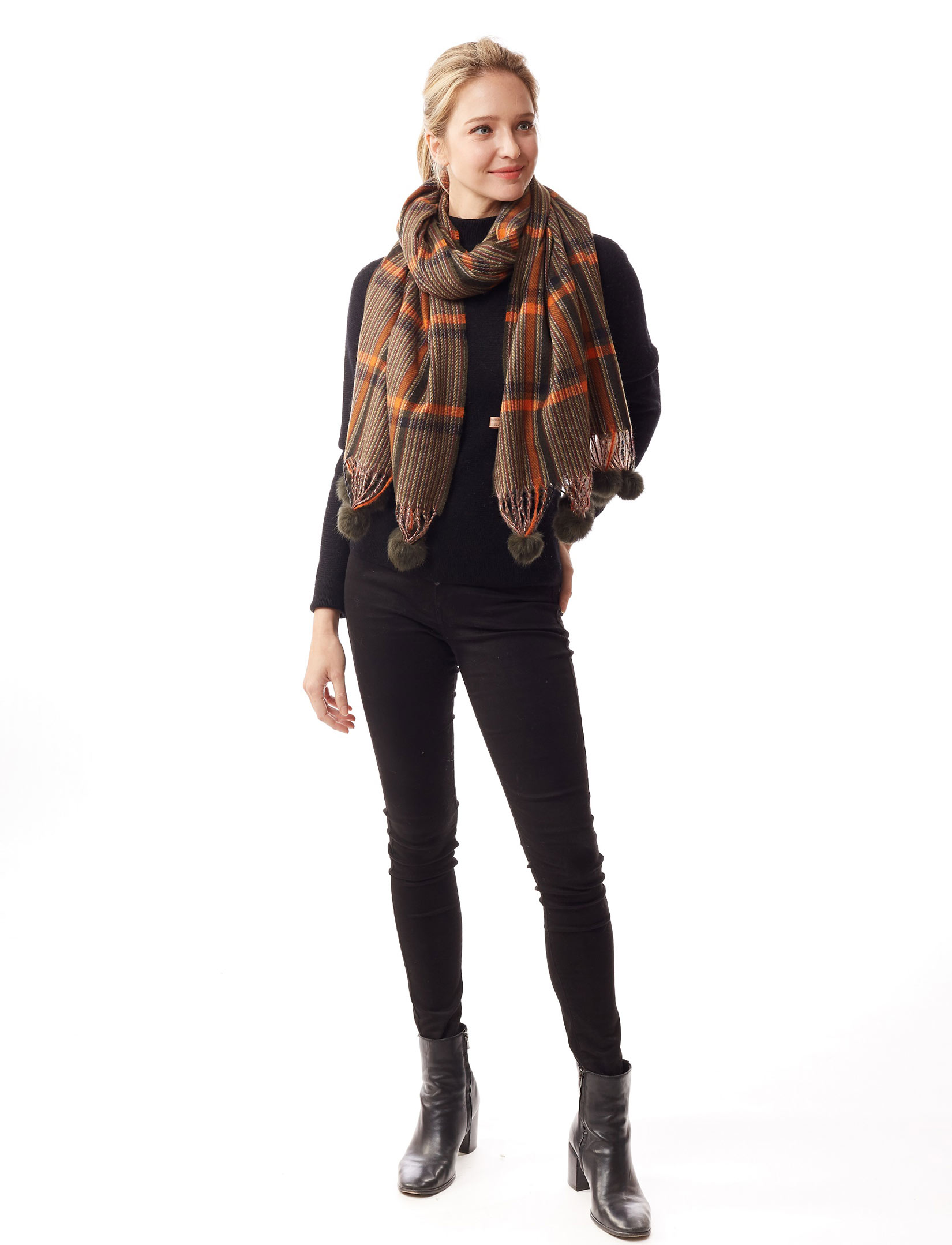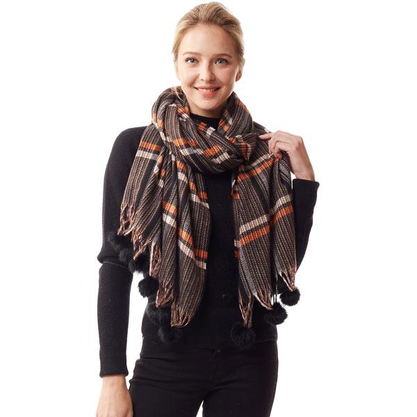 Plaid design with faux rabbit pom pom detail artistically attached to the fringe.