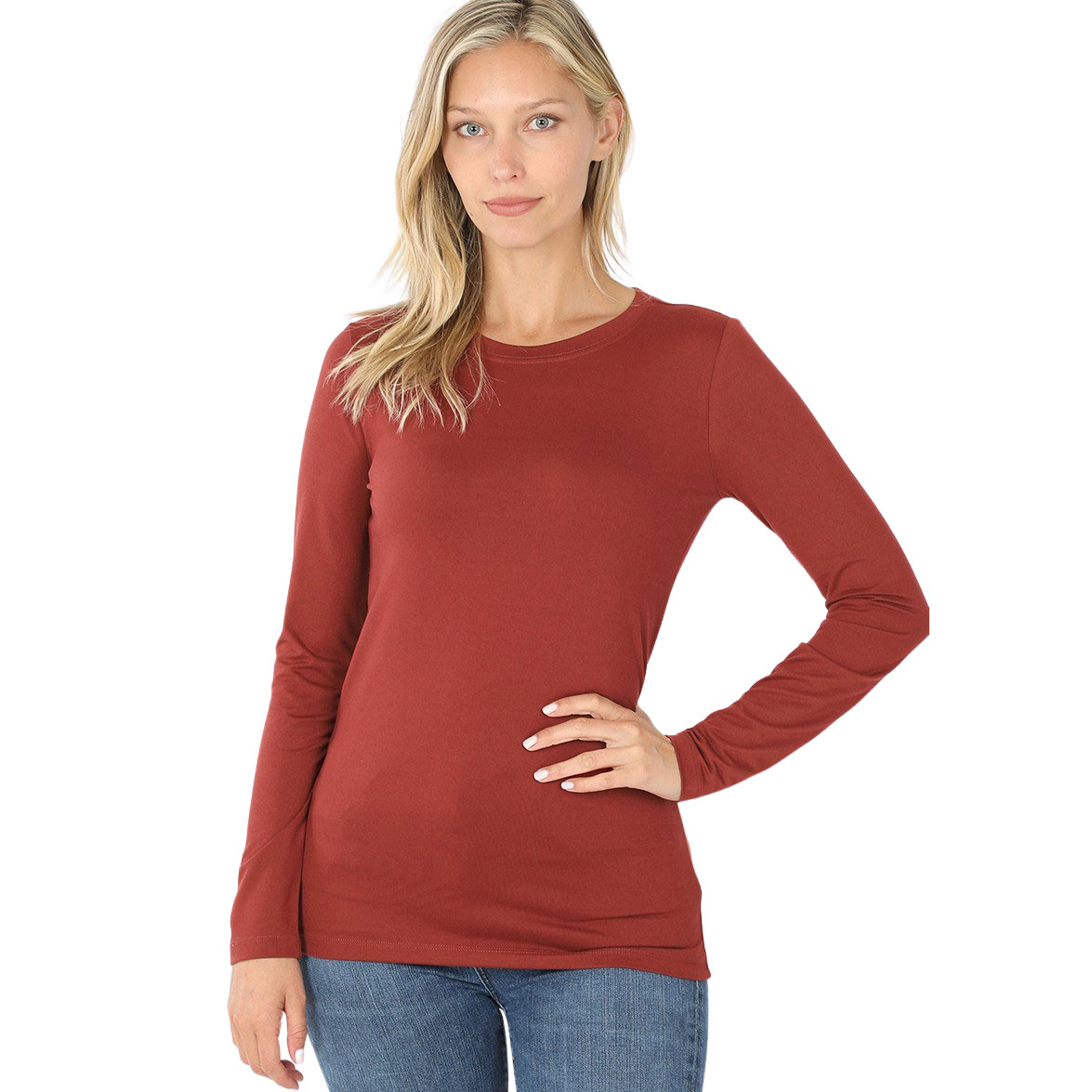 2053 - Round Neck Long Sleeve Tops Brick Brushed Fiber - Round Neck Long Sleeve 2053